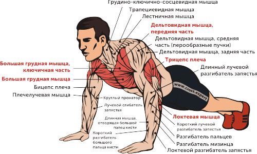 3. Вернитесь в исходное положение, разгибая руки. При этом выталкивайтесь силой трицепсов и грудных мышц.